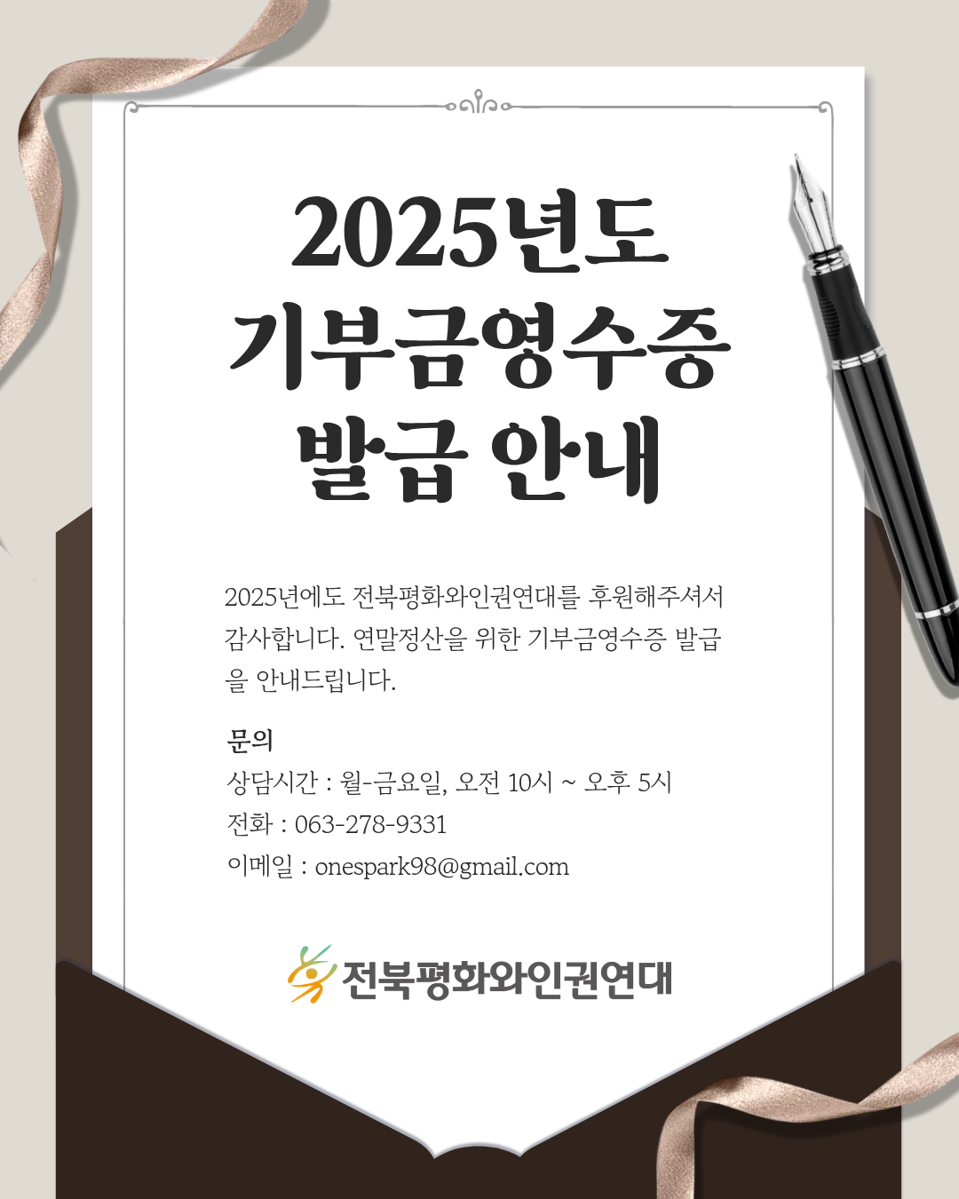 2025년에도 전북평화와인권연대를 후원해주셔서 감사합니다. 연말정산을 위한 기부금영수증 발급을 안내드립니다.