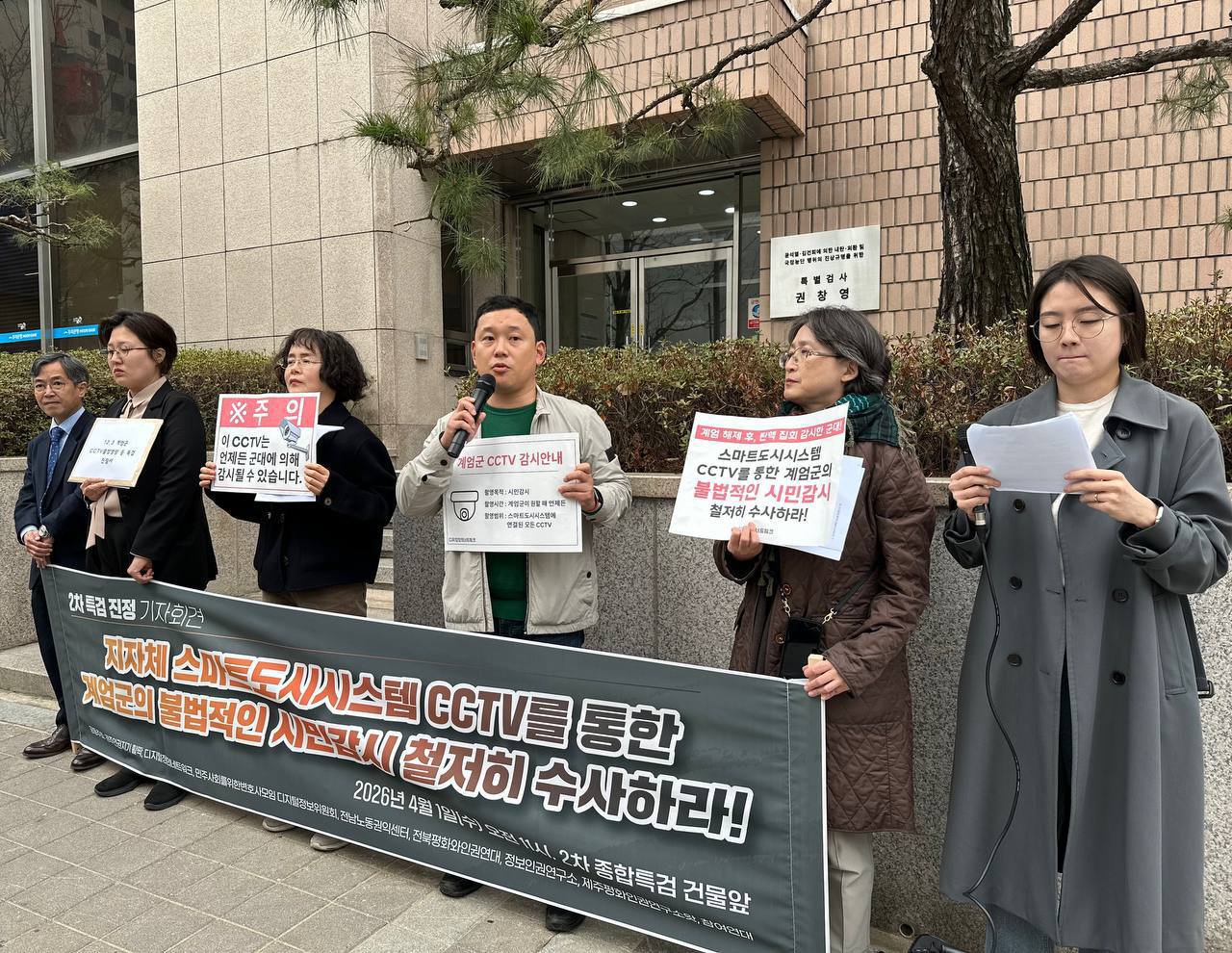 - 이에 인권시민사회단체(광주인권지기 활짝, 디지털정의네트워크, 민주사회를위한변호사모임 디지털정보위원회, 전남노동권익센터, 전북평화와인권연대, 정보인권연구소, 제주평화인권연구소왓, 참여연대)는 공동으로 “윤석열·김건희에 의한 내란·외환 및 국정농단 행위의 진상규명을 위한 특별검사(이하,’ 2차 특검’)”에 지자체 스마트도시시스템 CCTV를 통한 계엄군의 불법적인 시민감시에 대한 진정서를 제출하고 기자회견을 개최함. 진정서는 2차 특검이 서울시를 비롯한 각 지방자치단체의 스마트도시시스템을 통한 CCTV 조회 과정에서 생성되는 로그기록을 보존하고, 이를 철저히 수사하여 ①국방부 및 군이 비상계엄을 사전 준비하거나 동조, 후속조치를 지시·수행한 범죄 혐의 및 특히 비상계엄 해제 이후에도 2차 계엄을 통한 내란시도를 한 것은 아닌지 ②서울시를 비롯한 각 지방자치단체가 국방부 및 군의 CCTV 접속을 허용함으로써, 비상계엄 선포에 따른 후속조치 및 2차 계엄을 통한 내란시도를 방조하거나 공모한 것은 아닌지 철저히 수사할 것을 촉구하는 내용임.