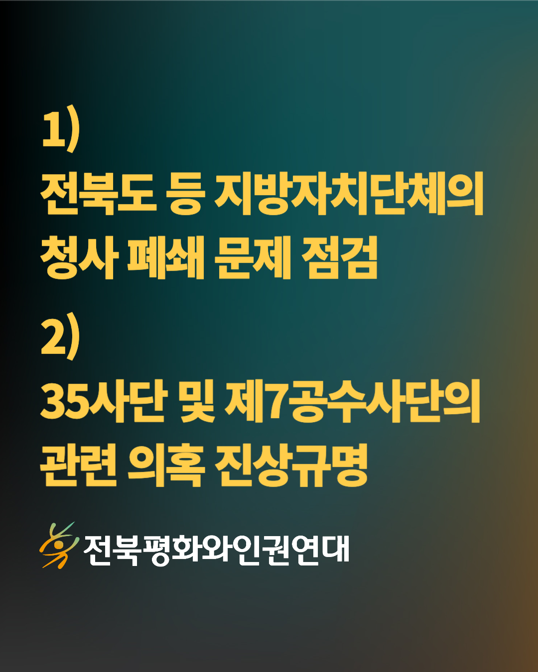 전북지역에 주둔한 군 병력들의 12.3 내란 사태 의혹들에 대한 진상규명도 필요하다. 지난 1월에 진행된 국회 <윤석열 내란 진상규명 국정조사특위>에서 제35사단장은 지역계엄사령부 설치에 대한 질의에 대해 사령부를 설치하지 않았다고 밝혔다. 경계태세2급 발령으로 매뉴얼에 따라 상황실만 설치하고 계엄이 해제되어 지역계엄사 구성은 하지 않았다는 것이다. 그러나 제31사단이 계엄의 위법성 검토가 필요하다는 내부 의견으로 계엄사를 구성하지 않았다는 증언 등이 있는만큼 실제로는 지역계엄사 구성 시도가 있었던 것이 아니냐는 의혹이 제기되었다. 또한 상황실 설치나 위기조치반 소집 정도라 할지라도 실질적으로는 지역계엄사령부 구성을 시도했다는 국회의 지적도 있었다. 따라서 지역계엄사 설치 의혹에 대한 면밀한 조사가 있어야 한다.